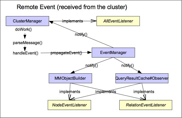 The EventManager will find the brokers that can handle events of this type, and the event will be propagated to the broker's listeners. In case of a node or relation event, those include the builder matching the type of the event, the Obsterver instance for the event type. Mind you, for a node event the 'type' of the event is the builder of the node, while for a relation event it's type is both the relation source type as the relation destination type. The ClusterManager will receive the event regardless of it's type.