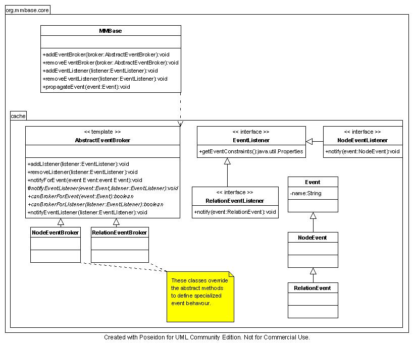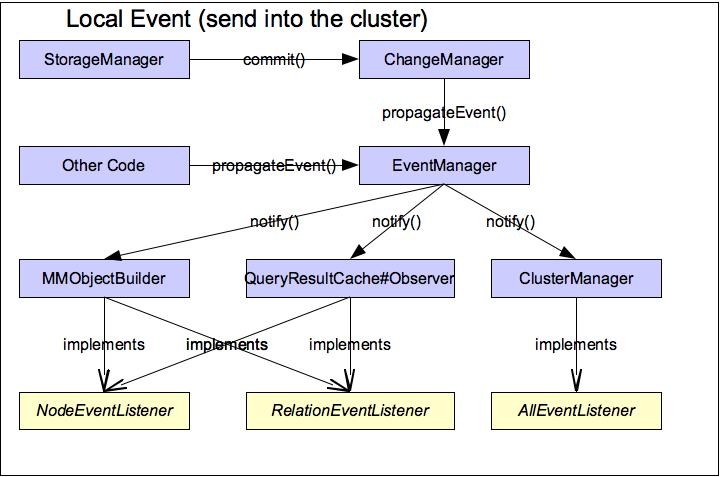 The core of the system is the EventManager. A singleton instance of this class is instantiated at startup time. This event manager is being loaded with brokers for a number of (MMBase) events. These are: NodeEvent, RelationEvent, and Event (by means of the AllEventBroker, used by the clustering application). If you want MMBase to load other event brokers as well, add them to the cluster manager configuration file eventManager.xml in the config directory. The event manager manages the brokers (one for each event type), and accepts listeners for these event types, as well as events (of any supported type) to pass on to the brokers. The event manager tries to find an event broker for every listener that is registered with it, and passes it on to the broker (that actually manages the listeners for it's event type`). are So what happens when an event is fired? 1 some code calls EventManager.propagateEvent(Event event). All event classes need to extend from event, so it can be any event. 2 the event manager iterates over it's event brokers, and asks each one if it can broker for this event (which mean it can deliver it to the right listeners. 3 The event broker (a specialization of AbstractEventBroker) calls canBrokerForEvent(Event event), (one of AbstractEventBroker's abstract methods you have to override to create an actual broker) to discover if this event is for him. 4 if so, the broker iterates over it's listeners, and propagates the event.